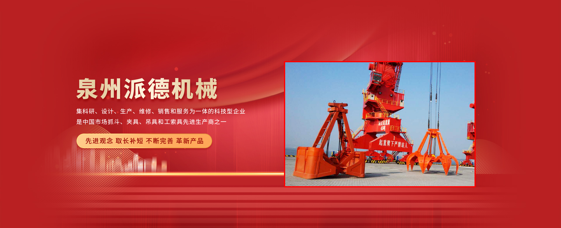 泉州派德機(jī)械有限公司成立于2012年5月,位于全國(guó)文明的古城福建泉州,公司擁有各類(lèi)型專(zhuān)業(yè)員工82人,其中高級(jí)工程師1人,工程師4人,助理工程師5人,是一家集科研、設(shè)計(jì)、生產(chǎn)、維修、銷(xiāo)售和服務(wù)為一體的科技型企業(yè),是中國(guó)市場(chǎng)抓斗、夾具、吊具和工索具先進(jìn)生產(chǎn)商之一。產(chǎn)品采用國(guó)內(nèi)外先進(jìn)的設(shè)計(jì)方案、技術(shù)規(guī)范、制造過(guò)程、工藝流程和服務(wù),憑借在抓斗、夾具、吊具和工索具領(lǐng)域的超前設(shè)計(jì)理念和成熟的技術(shù)、工藝和管理,在抓具領(lǐng)域迅速崛起。